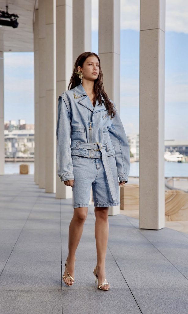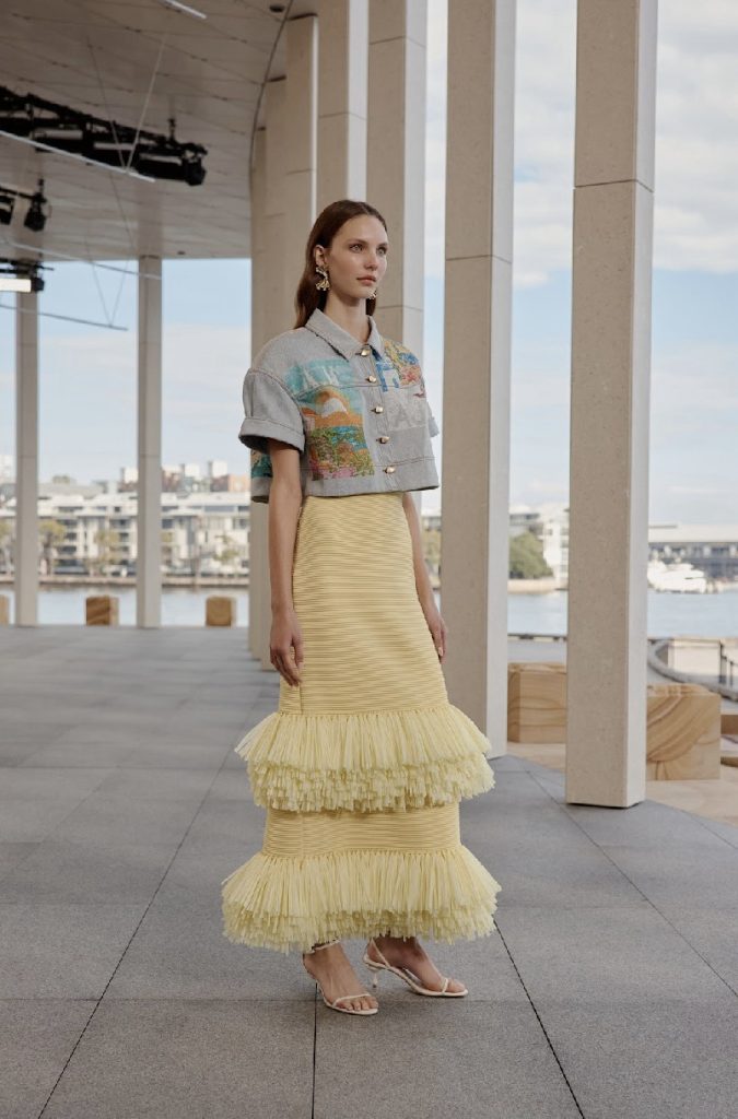 Water-inspired accents shimmered in sequin-bathed separates, while silk pieces flow like mist across the body. Nostalgic coastal elements resurface through pearlescent details, lace-layered denim, and sun-faded prints. The colour story moved through painterly pastels, grounded earth tones, and bursts of magenta, sunshine yellow, and vibrant red, evoking both Monet’s palette and Australia’s visceral light.