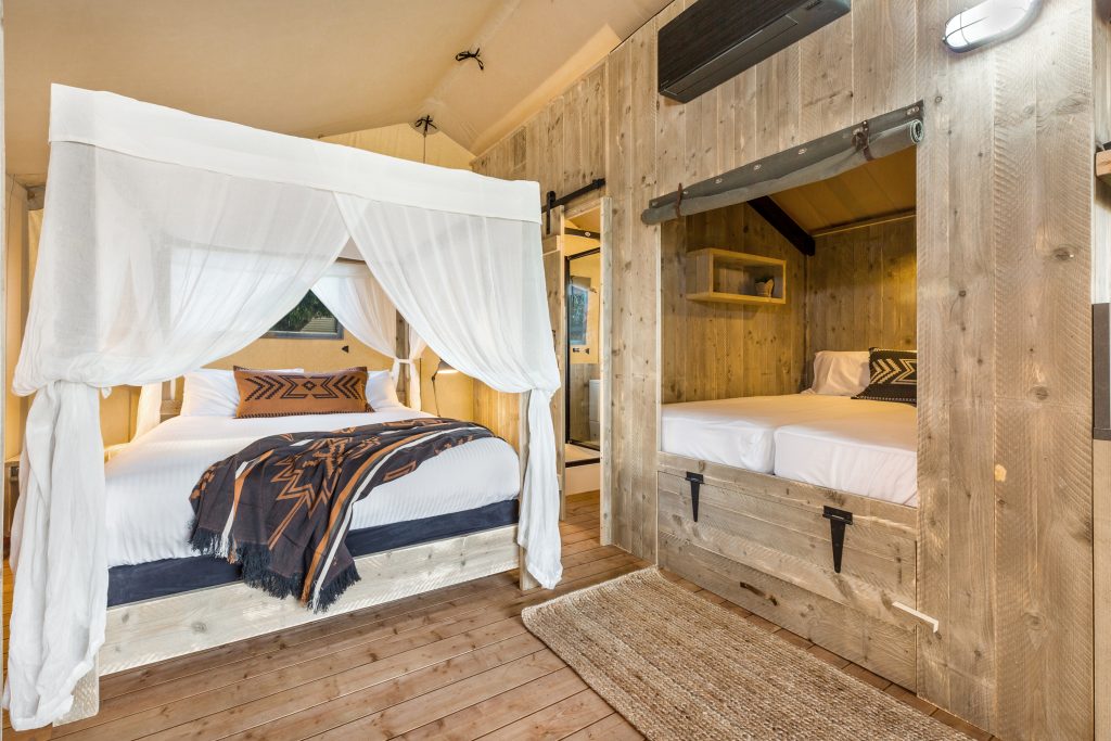 The new luxe tents offer roomy, pole-free spaces for maximum relaxation, with a perfect balance between camping and comfort. A tent-cabin hybrid, the Glamping Tents boast stunning timber interiors and are equipped with all the bells and whistles to ensure only the most luxurious of stays. With an ensuite and a private balcony bathtub, a kitchenette, and room for four campers in a spacious queen and two single beds, this option is great for families or groups of friends. The Bell Tents are sure to impress with their iconic round shape and high canopy that create a truly magical space. Featuring a luxe queen size bed and charming decor for a finishing touch, these tents will make any camping getaway that little bit more special.