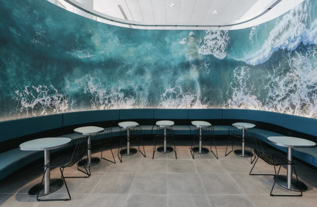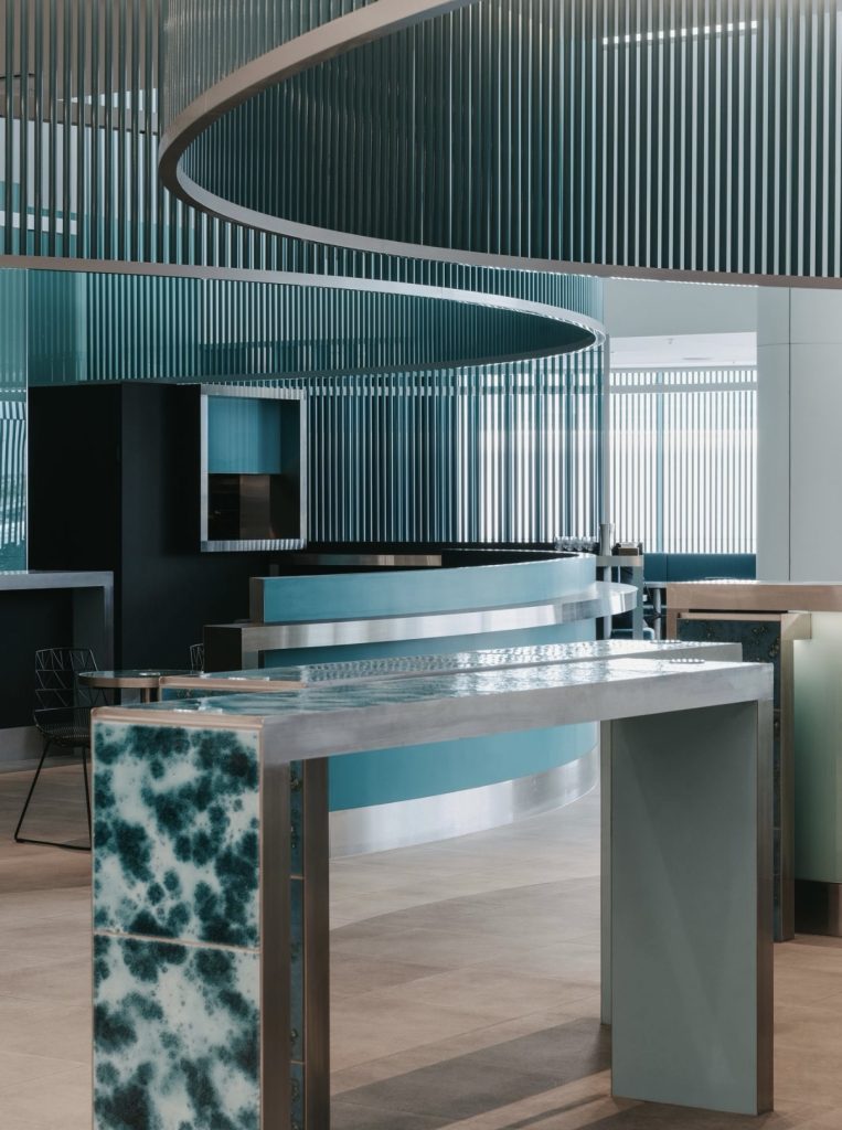 Every design choice evokes the rhythm and palette of Bondi’s ocean and sky. From the crystallised waves inspired by the sculptural wave seating banquettes from the original Bondi venue to the hand-glazed custom made Tuscan tiles used throughout the space for tables and benches. These elements, inspired by the ocean, bring a tactile, human warmth to the airport interior, offering a direct connection to the materials used in Bondi, while also grounding the space with artisan craftsmanship. The result is a timeless, sensory space that feels both familiar and entirely new.