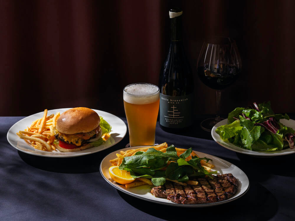 Smaller Plates feature Spanner Crab Crumpets with Sweet Corn and Lardo; Chicken Liver Eclairs with Trout Roe & Amaro Jelly; and Swordfish Crudo with Pink Grapefruit, Yarra Valley Salmon Roe and EVOO, a Slow Ferment Sourdough Toastie with Fontina, Black Pig Ham & Pickles, a classic Wagyu Beef Burger. Bistro classics include La Stella burrata; fritto misto- prawns, ling and calamari; and Stone Axe full blood Wagyu Bresaola.